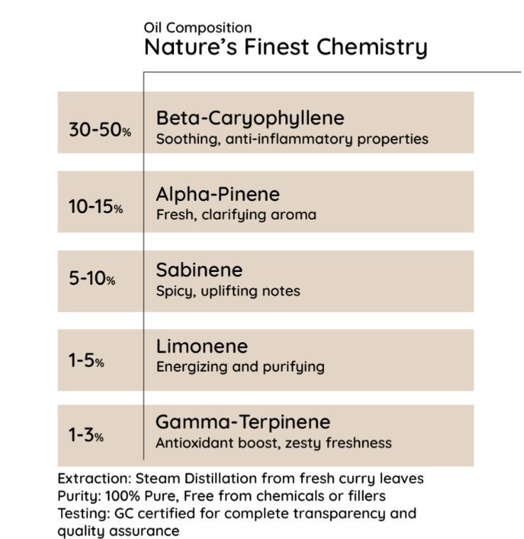 Harvested at the peak of vitality, our curry leaves are carefully handpicked and steam distilled to preserve their bold, herbaceous character. The resulting oil is a deep, green elixir vibrant, earthy, and beautifully grounding.