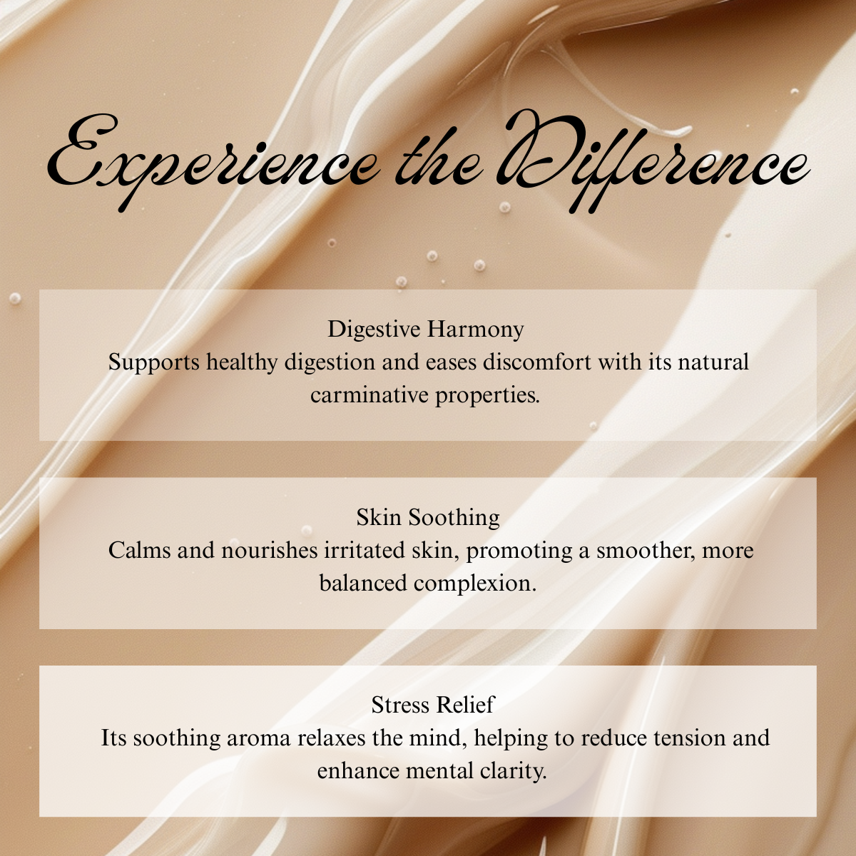 Dilute with a carrier oil and massage onto the abdomen or temples to soothe and relax.