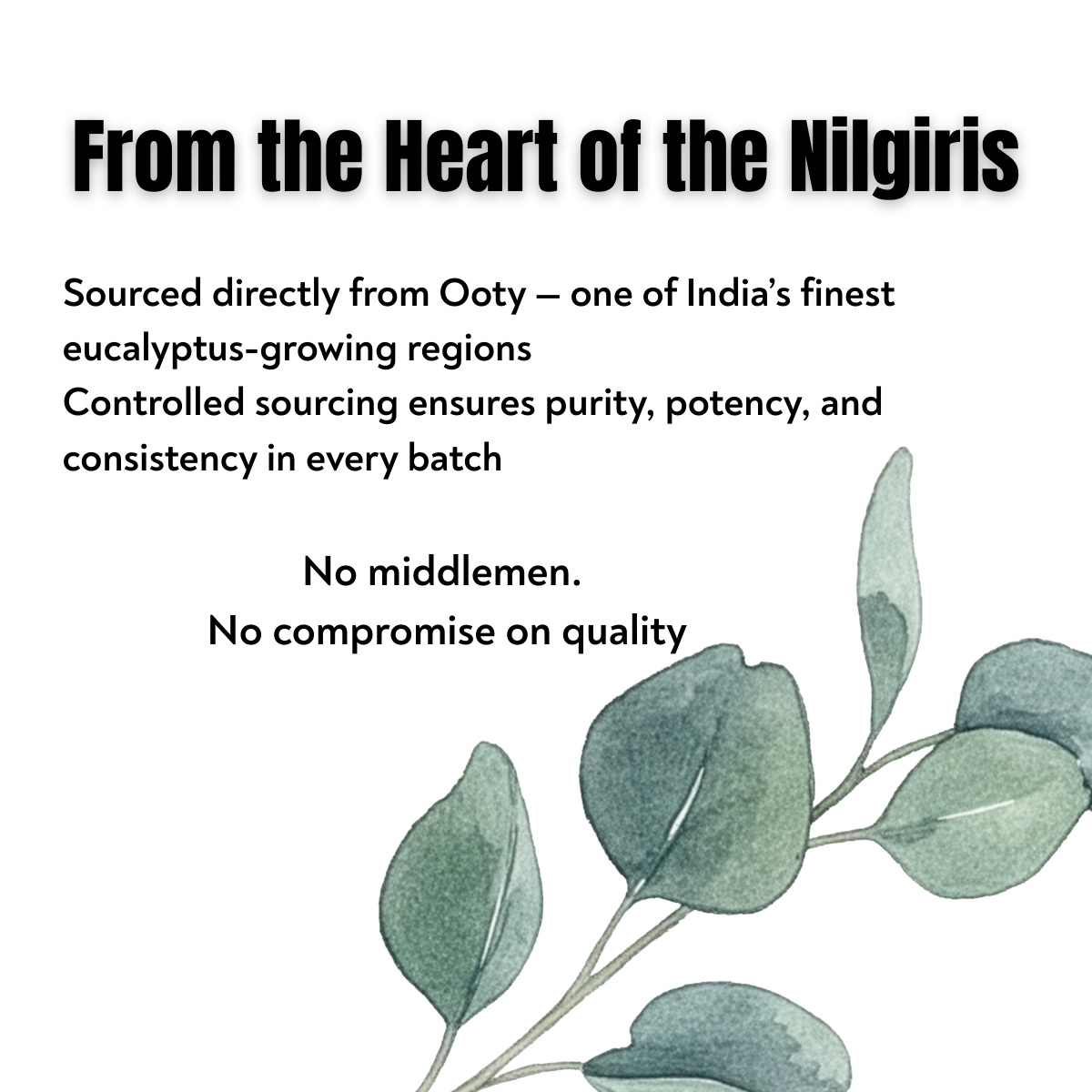Sourced from the pristine Nilgiri region, where climate and altitude enhance eucalyptus potency.