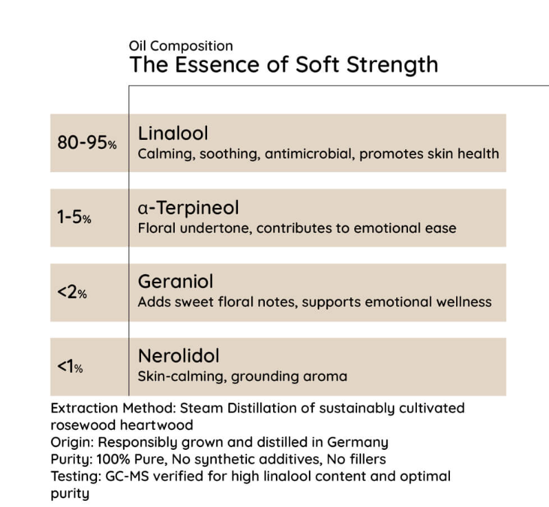 From the tranquil forests of Germany, where sustainability meets botanical artistry, our Rosewood Essential Oil is distilled with quiet reverence and expert care. Extracted from the heartwood of sustainably grown Aniba rosaeodora trees cultivated under responsible practices, this rare oil unveils a fragrance that is soft yet confident, floral yet grounding a breath of serenity wrapped in subtle sophistication.