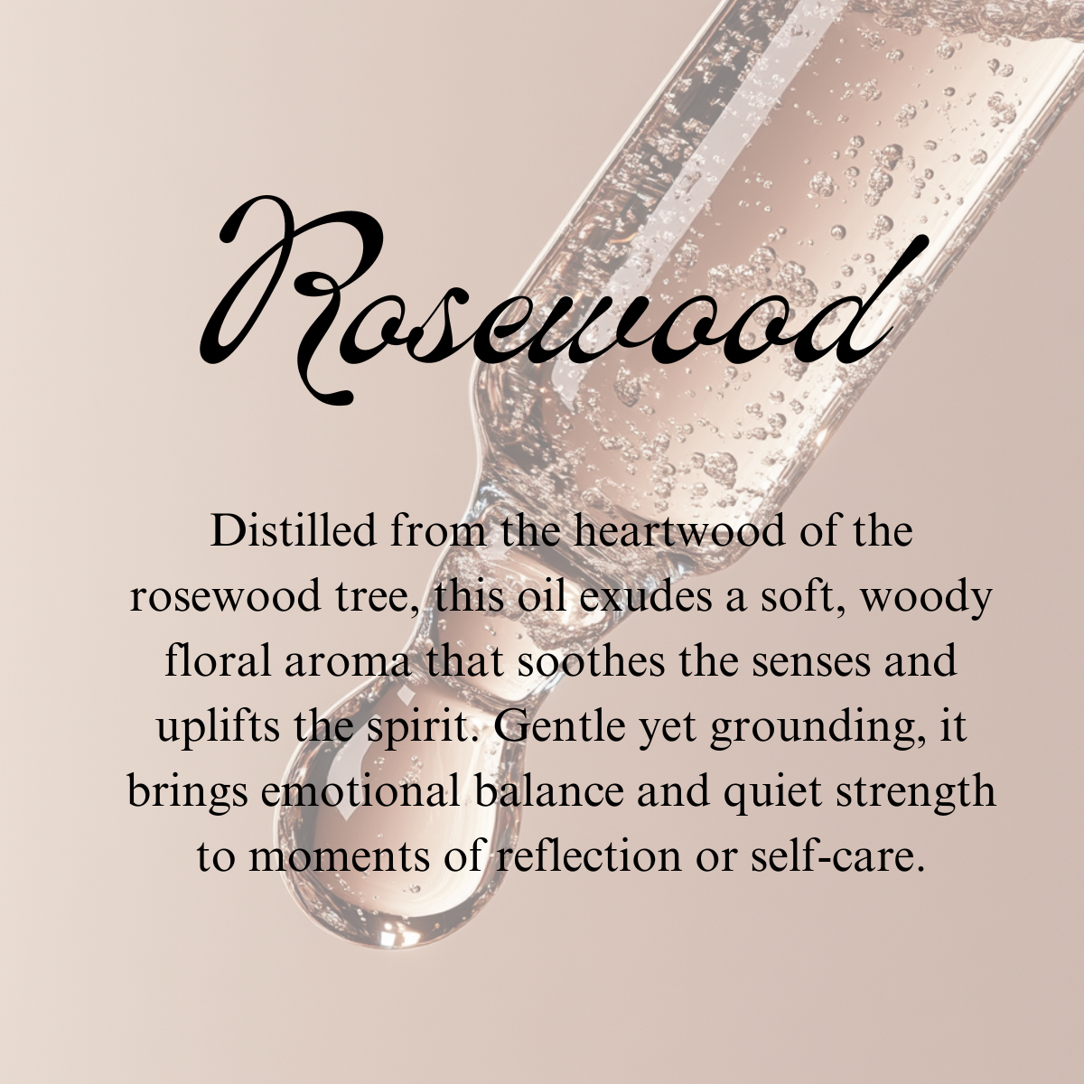 Extracted from sustainably sourced Aniba rosaeodora wood, our Rosewood Oil emits a soft, woody-floral aroma that balances luxury and serenity.
