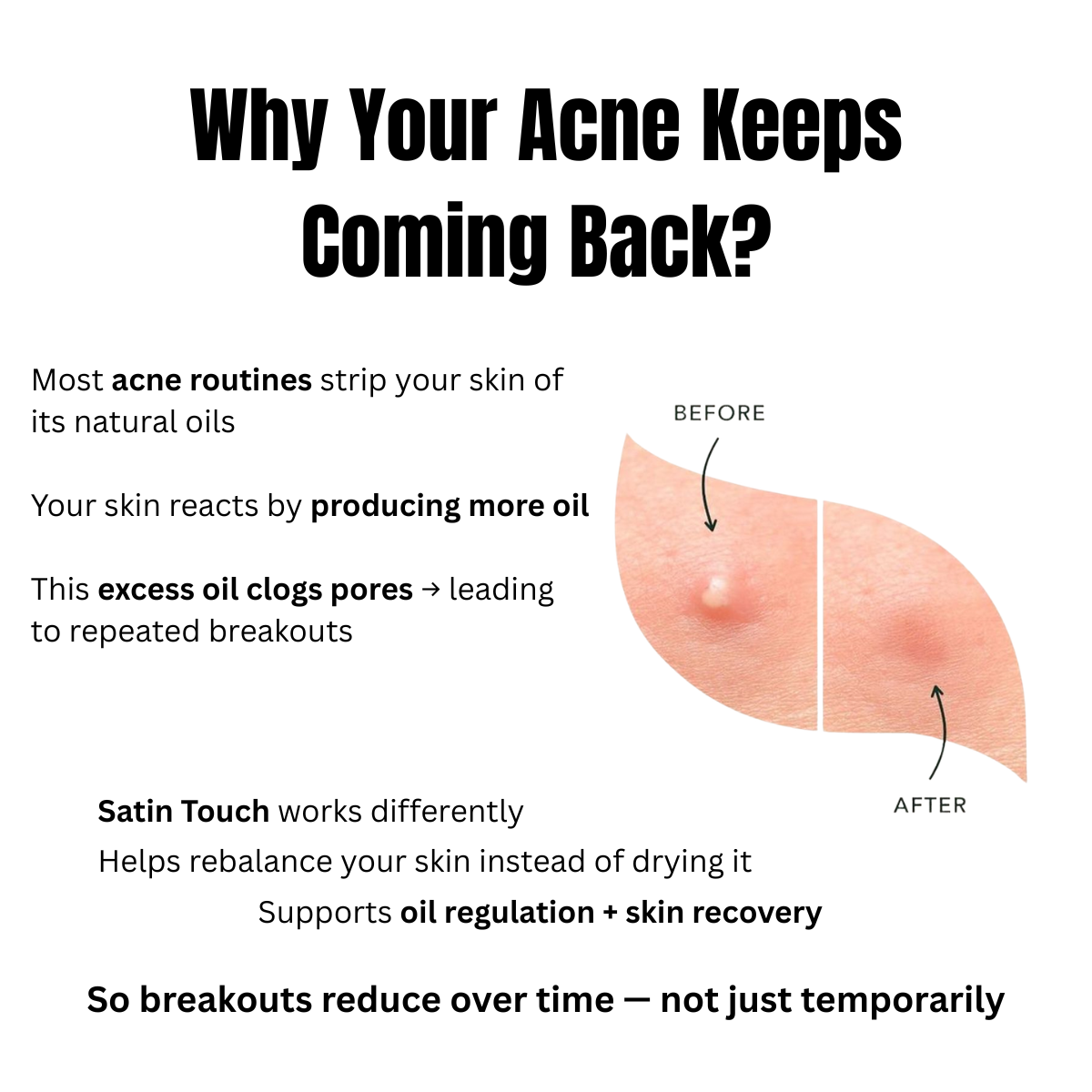 Satin Touch is a thoughtfully formulated natural acne oil for pimples, blemishes, and acne-prone skin, designed to support clearer, healthier-looking skin without stripping away its essential moisture.